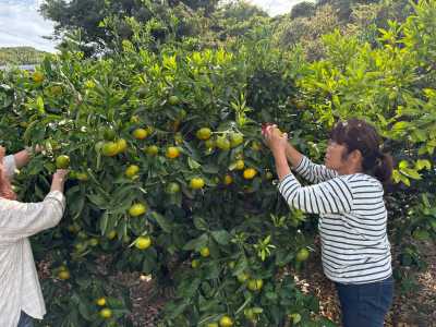 頂いたプラスチックのカゴに味見をしながらみかんを詰めるだけ詰める。