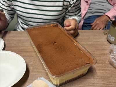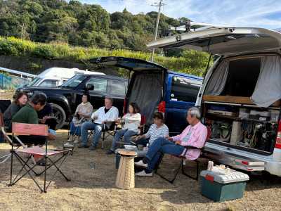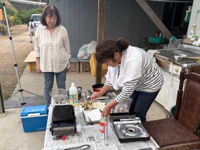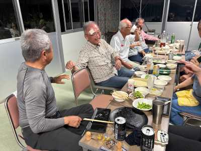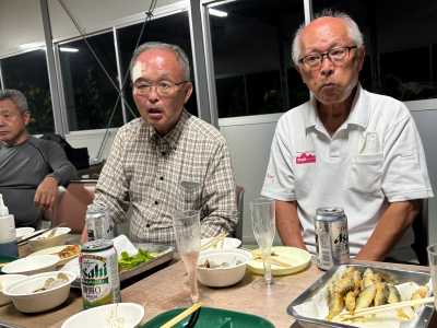 夕食は併設のプレハブ(みかんの選別作業場との事)でテーブル・椅子を並べてバイキング形式で持ち寄り食材を頂く。
