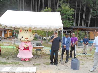 明日はひょっとしたら雨かもとの事で開村式と同時に記念撮影。すぐ近くに温泉ができたとのことで、行かれた方の話では格安でこじんまりして良かったとの事です。 夕食も終わった夜8時から小川で「ホタル観賞」が始まり、あちらこちらで光ってました。あとはお決まり焚き火を囲んで遅くまで盛り上がりました。