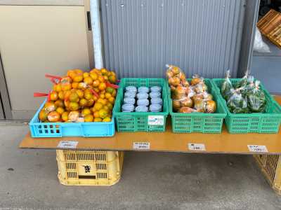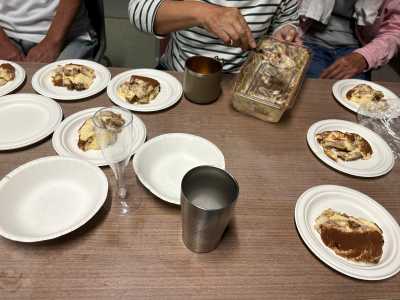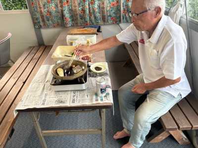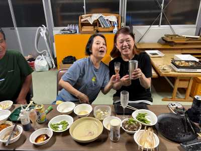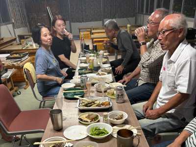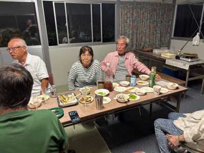 夕食は併設のプレハブ(みかんの選別作業場との事)でテーブル・椅子を並べてバイキング形式で持ち寄り食材を頂く。